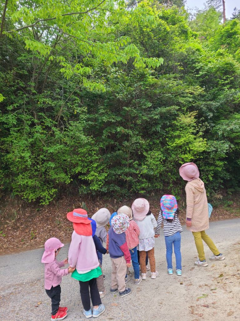 「あそこの木から聞こえる!」と、子どもたちと一緒に見上げています。